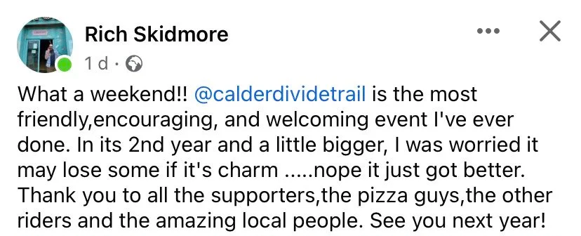 We hire in three portable toilets with sinks but there are no showers and no hot water. There are two water taps and a cosy barn where riders register, lock their bikes up and we gather on Saturday night to have the quiz (7pm).