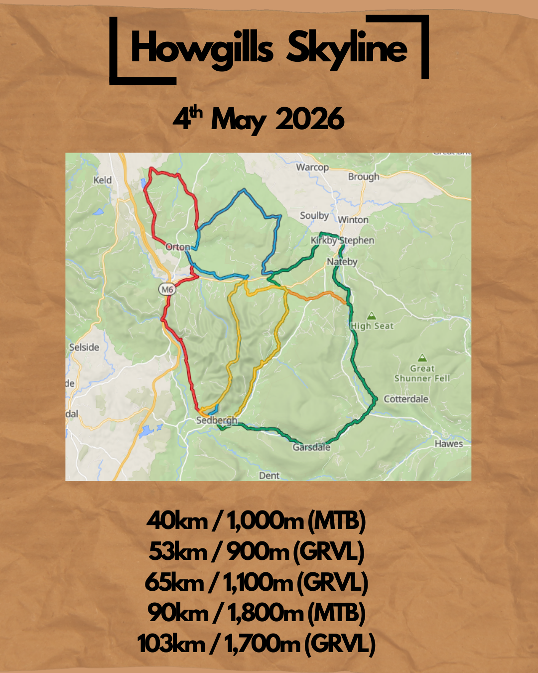 The Howgills Skyline event is part of a long weekend of three events with start lines in Mytholmroyd to ride the Calder Skyline on Saturday 2nd May and Settle to ride the Ribblehead Skyline. The event is called the Pennine Skyline and entry is currently open.
