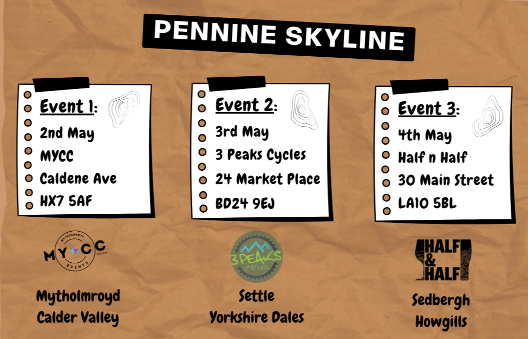 The Pennine Skyline is a set of three events from three venues that give you a chance to explore tracks and lanes on the moors, valleys and woods found within three sections of the Pennines, the chain of hills and high mountain ridges that run along the backbone of England.