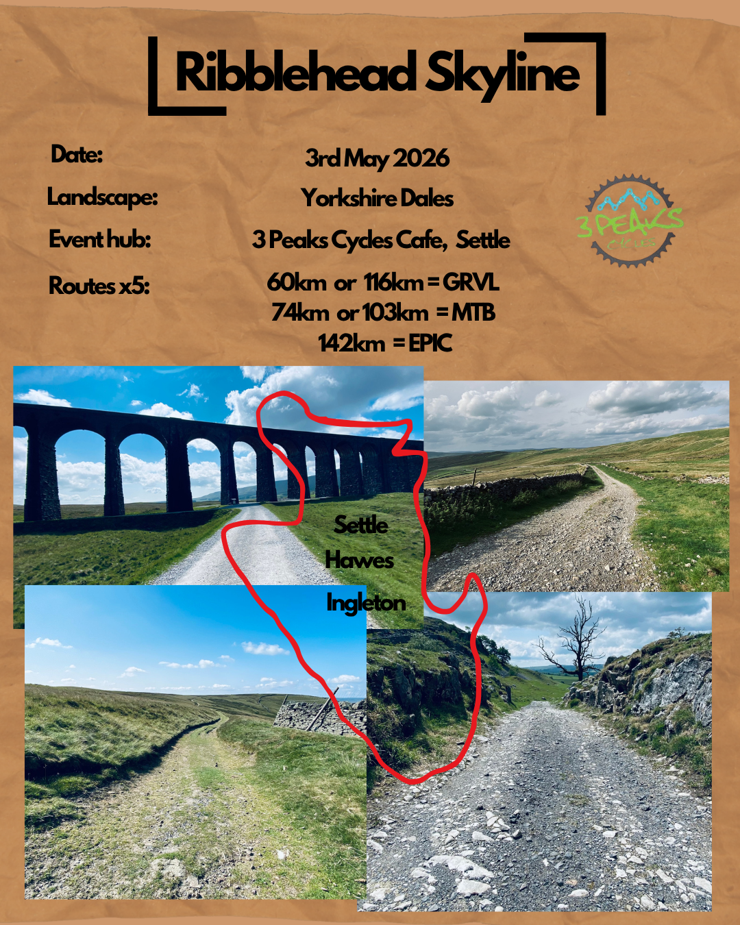 The Ribblehead Skyline event is part of a long weekend of three events with start lines in Mytholmroyd to ride the Calder Skyline on Saturday 2nd May and Sedbergh to ride the Howgills Skyline on Monday 4th May. The event is called the Pennine Skyline