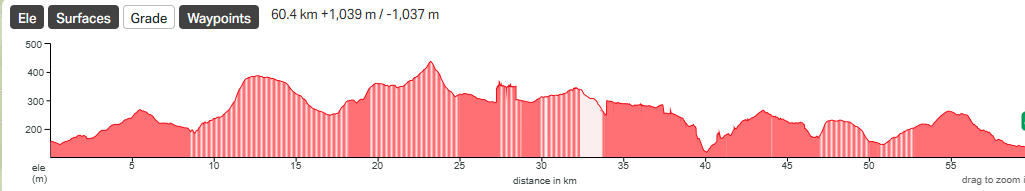 Gravel route: 60km and 1,000 metres // 37 miles and 3,200 ft