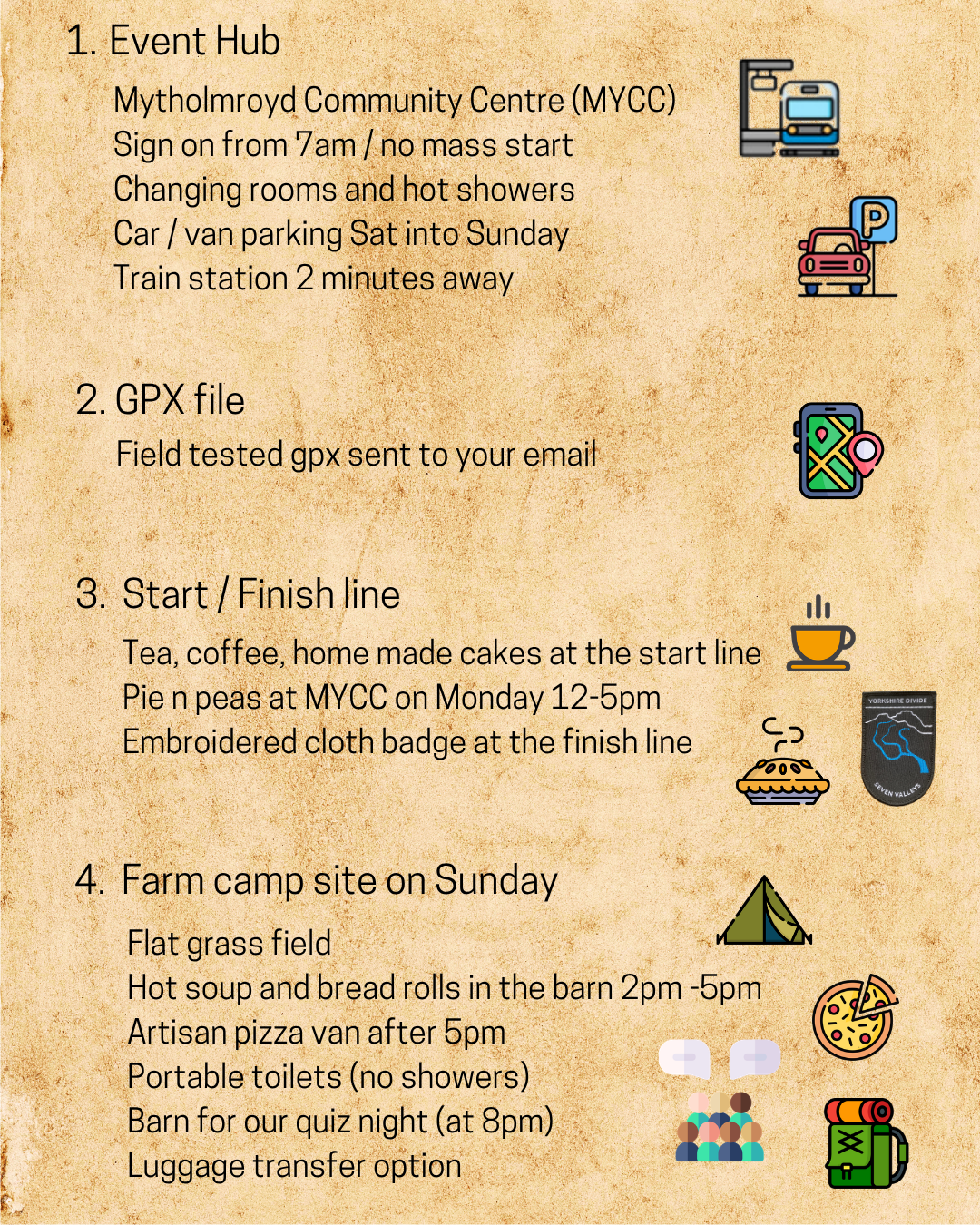 Riders on the ‘oner’ should be aware that the event team is at Mytholmroyd Community Centre on Sunday morning but by midday Sunday and through till early Monday they are up at the campsite in Shepley. Hence there is no flag waving or bell ringing (at least not from the event team) to greet you as you pass the finish line after your epic one day ride and no pie n peas on Sunday. But there will be a badge (in your registration envelope when you sign on) and there are three pubs in Mytholmroyd and more in Hebden Bridge with plenty of eating places to choose from.