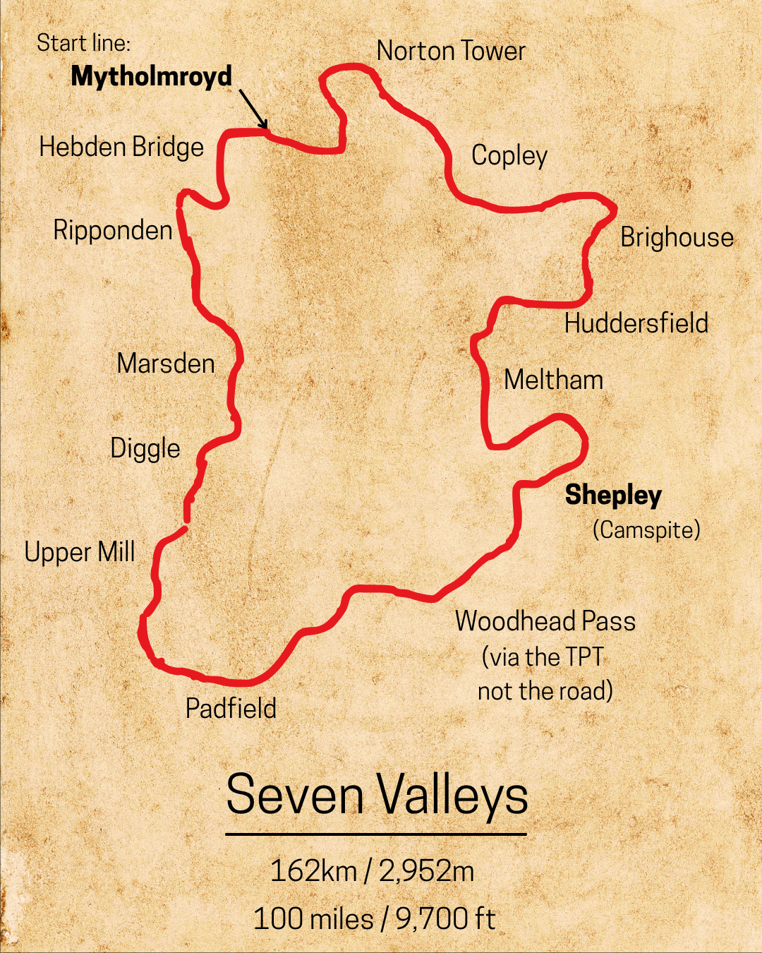 i. Between the start line and the campsite at 88km (55 miles) we cross four of the Seven Valleys - Calder, Ryburn, Tame and Langdendale. These valleys are fairly evenly spaced out so as a rider there is a pattern of steep climb, brief ride on the moorland plateau, then descent.