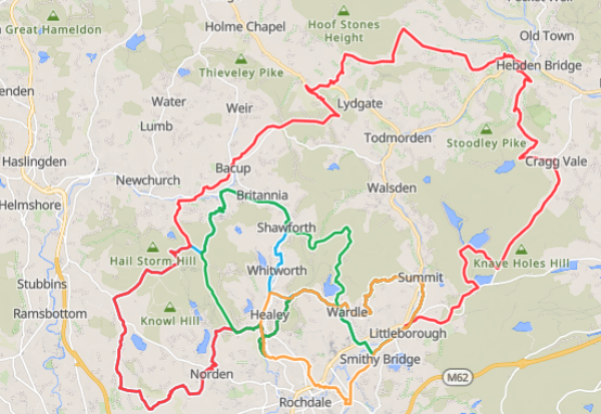 Healey Dell, Facit, Bacup Old Road, Flower Scar Moor, Dukes Cut, Top Lane, White House